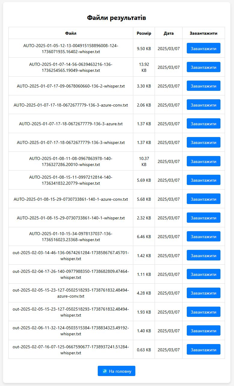 Користувач може переглядати результати транскрипції безпосередньо на сайті. Для кожного файлу відображається текст, статус обробки, можливість завантаження результатів у текстовому (.txt) або Excel (.xlsx) форматах.