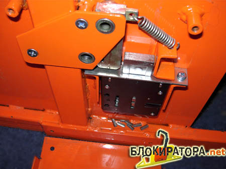 Обратите внимание на шестерню, которая блокирует верхнюю кочергу! От такого усилия у неё раскрошились зубцы, фиксирующие кочергу. Достаточно сорвать эти зубцы, как кочергу блокиратора ничего не будет удерживать.
