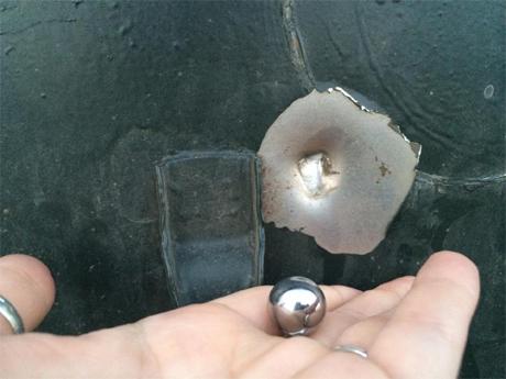 Снаряд от реактивной установки "Ураган". / После минометного обстрела. Бочка для воды между Счастьем и Луганском.