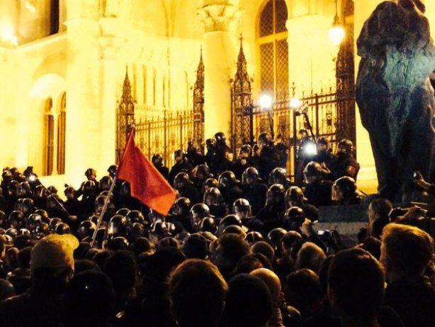 Ровно неделю назад протестующие уже собирались с аналогичным требованием, а также просили вмешательства ЕС. В настоящее время у входа в здание парламента наблюдается толкотня между активистами и полицейскими.