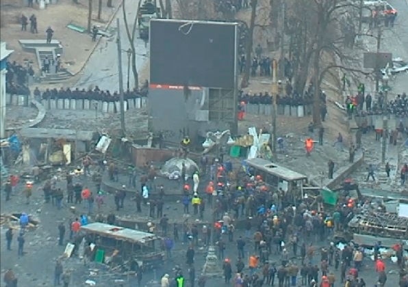 15:48 Митингующие на улице Грушевского в Киеве отодвинули часть сожженной спецтехники в сторону Европейской площади, тем самым создав еще одну линию баррикад на случай обострения противостояния между демонстрантами и спецназначенцами силовиков.