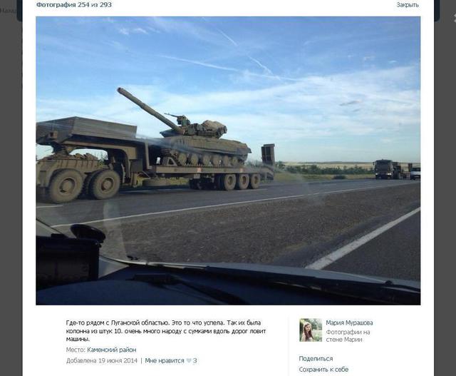 Вполне предсказуемо оказывается, что танки Т-64БВ на российских тягачах с трассы М4 "Дон" 19-го июня и танки Т-64БВ под флагами сепаратистов в украинских городах на Донбассе 20-го июня - одни и те же. Два со штатной динамической защитой на бортах, три с самопальной, на крышах башен какое-то имущество, укрытое брезентом: