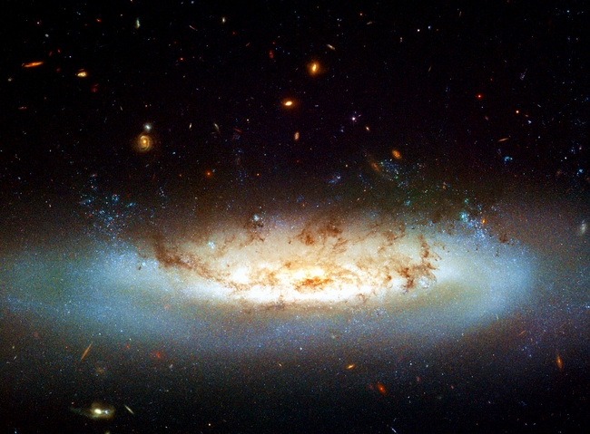 Фантастическая куча молодых голубых звёздных скоплений, гигантские светящиеся газовые облака и тёмные пылевые прожилки окружают центральную область активной галактики Центавр А. Центавр A находится близко от Земли, на расстоянии 10 миллионов световых лет.