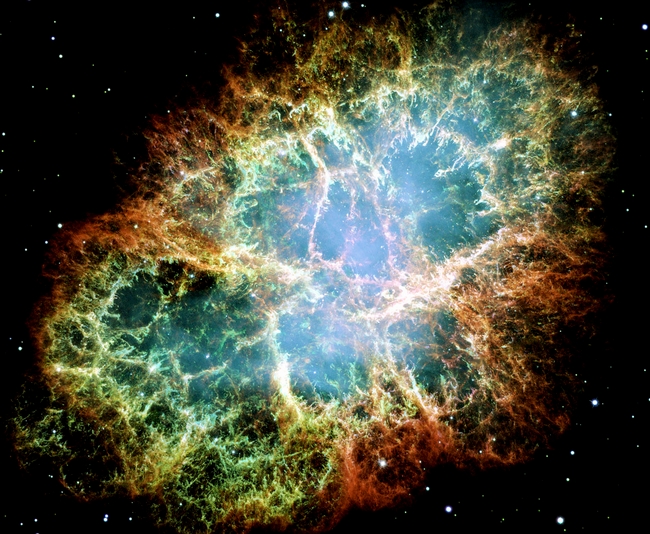 Эта путаница осталась после взрыва звезды. Крабовидная туманность является результатом взрыва сверхновой, который наблюдали в 1054 году нашей эры. Остаток сверхновой наполнен таинственными волокнами. Протяженность Крабовидной туманности составляет десять световых лет. В самом центре туманности находится пульсар — нейтронная звезда с массой, равной массе Солнца, которая умещается в области размером с небольшой городок.