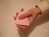 Данный прием часто используется тогда, когда необходимо сдать карты не сверху колоды, а снизу, при полной иллюзии того, что карты сдаются сверху колоды. Для этого сделайте следующее. Возьмите колоду в левую руку так, как это показано на фотографии, что ниже.