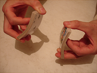 Положите колоду на стол перед собой таким образом, чтобы ее стороны были параллельно краю стола. Правой рукой снимите примерно половину карт и положите стопки карт концами друг к другу. Затем поместите Ваши руки на стопки карт, большими пальцами на соседние внутренние углы, указательные пальцы лежат на рубашке ближе к концам, а средний, безымянный и мизинец расположены на внешних сторонах. Положение левой руки должно быть симметрично положению правой руки. После этого захватите стопки карт между большими пальцами с одной стороны и средними и безымянными пальцами с другой стороны. Приподнимите внутренние углы большими пальцами, чуть сгибая карты, давящими вниз указательными пальцами, как показано на фотографии, что ниже.