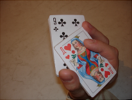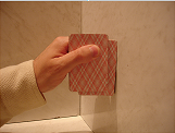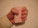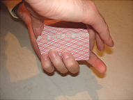 После этого надвиньте большим пальцем левой руки часть колоды, которая расположена под этим пальцем, а указательный, средний, безымянный пальцы и мизинец соответственно должны в этот момент отпустить часть колоды, которую держат и не должны ее больше держать, и позволить ей лежать на одном безымянном пальце, и дать возможность части колоды, которая находится под большим пальцем, наехать на часть колоды, которая находится под ней. После того, как обе части колоды соединятся вместе, то безымянный палец левой руки может покинуть свое место под колодой карт и занять свое обычное место, как показано на фотографии, что ниже.