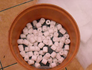4 слой. Наполняем "био шариками" субстрат для колоний бактерий-нитрификаторов. В этой секции и происходят все таинства азотного цикла. Здесь мирно уживаются и гетеротрофы, и нитрификаторы, и денитрификаторы, исправно выполняя возложенные на них обязанности; рабочий объем камеры должен составлять 4/5 от емкости корпуса биофильтра. В качестве субстракта для бактерий можно использовать керамзит (желательно дробленый) поскольку имеет пористую структуру.