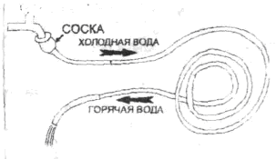 Нужно изготовить из длинной медной трубки диаметром 15 мм спираль. На каждый её конец надеть резиновый шланг. Один шланг соединить с водопроводным краном (если сечение шланга не подходит к диаметру сечения крана, воспользуйтесь детской соской с отрезанным концом - такое соединение позволит легко надевать шланг на кран в нужный момент).