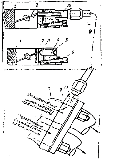 В нижней половине корпуса карбюратора 1, где расположена дроссельная заслонка 2, над винтом 6 регулировки холостого хода (эмульсионным винтом) имеется технологическая заглушка 5, которую необходимо высверлить. За ней откроется отверстие 4, заканчивающееся каналом 3 системы холостого хода. В отверстии нужно нарезать резьбу М8х1, а канал рассверлить до диаметр. 6. Канал нужно рассверлить точно по оси резьбового отверстия. Для этого необходимо изготовить втулку-кондуктор с наружной резьбой М8х1 и отверстие диаметр. 6 мм, ввернуть кондуктор в отверстие 4 и рассверлить через него. По диаметру канала 3 с противоположных сторон нужно пропилить две неглубокие горизонтальные канавки. Это необходимо для того, чтобы при резком нажатии на педаль дроссельной заслонки не было провала оборотов двигателя.На этом переделка карбюратора, которая при минимальных слесарных навыках доступна автолюбителю, заканчивается. Необходима еще минимальная переделка впускного коллектора 7. В его фланце 8 в зоне патрубков, через которые удаляются выхлопные газы из 2го и 3го цилиндров, нужно просверлить сквозное отверстие и нарезать резьбу М8х1. Потребуются и дополнительные детали: медная трубка 9 и два штуцера 10 и 11. Штуцер 10 . нужно ввернуть в корпус карбюратора, а штуцер 11 - во фланец выпускного < коллектора. Медная трубка должна быть диаметром 8x6 мм с двумя накидными гайками. Конструкция концов трубки совместно с накидными гайками должна обеспечивать герметичность соединения трубки со штуцерами.