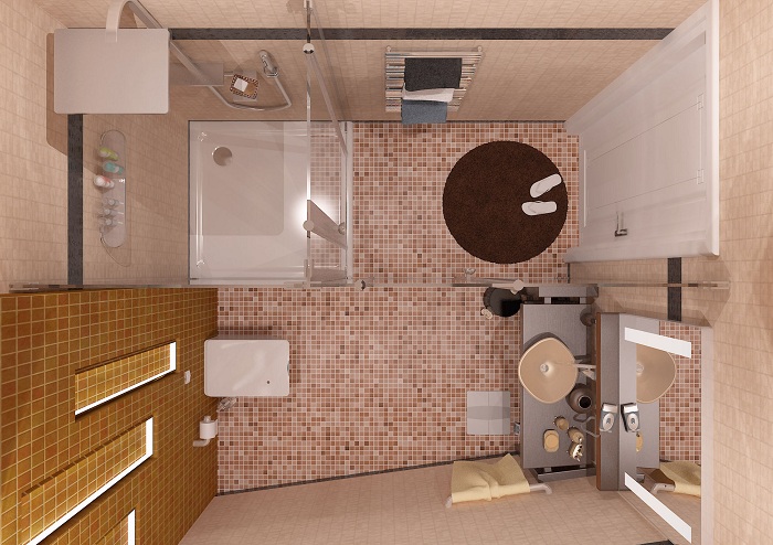 Если основные составляющие части ванной комнаты разместить в углу, то это позволит в свою очередь расширить комнату.