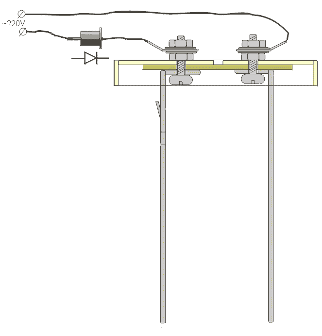проделать 3 отверстия: 2 крепежные, одно газоотводное. При работе устройства, около пластин заметно выделение газа. Видимо обработка идет по типу слабого гидролиза, соответственно выделение газа - побочный продукт. Это отверстие как раз для выравнивания давления внутри и снаружи банки при закрытой крышке. Порядок сборки устройства хорошо видно на рисунке приведенном ниже: ![]() Как видите, ничего сложного. Можно отметить, что гаек на каждом болту должно быть по две. Одна для крепежа электрода, другая для обеспечения надежного контакта. Для контакта применены площадки от диодов типа КД202, зажатые между двумя шайбами. В качестве диода можно применить любые с рабочим напряжение около 400 вольт. Единственное условие - подключать его нужно так как показано на рисунке, иначе католит у Вас получится не в мешочке, а вокруг него, т.е. всё наоборот. Если применить диод КД202, то крепить к его резьбе можно непосредственно анодную пластину, заметьте - анодную, т.к. на корпусе у него анод. А катод тогда подключен непосредственно к 220. Правда, сам я применил вообще диодный мост. Как сами понимаете у двуполупериодного выпрямителя и производительность в два раза больше. По эксплуатации можно заметить следующее: - Края мешочка должны находиться немного выше уровня воды, чтобы не произошло смешивания фракций. - Время экспонирования 10-15 минут. Или до легкого нагрева банки. Можно конечно поднять литературу и измерять кислотность католита лакмусовыми бумажками и т.п., но мне кажется это лишнее. Крепость католита вполне можно определить по запаху. - Не применяйте воду прямо из-под крана. При содержащемся в ней хлоре, вполне можно предположить, что в католите будет присутствовать HCl, т.е. соляная кислота. Воду нужно отстоять хотя бы 4-5 часов. Все размеры приведены из расчета на 3-х литровую банку Дополнение от нашего читателя Михаил Клычков double_dragon@mail.ru Здравствуйте. Описанный метод получения "живой" воды имеет один недостаток. Дело в том, что использовать разделительный мешочек довольно хлопотно. Доставать "живую" воду надо очень осторожно, чтоб не смешать с "мёртвой". Это неудобно. Мне попадалась статья с другим способом получения "живой" и "мёртвой" воды. Суть в следующем. Нужна не одна диэлектрическая ёмкость для воды, а две. Ёмкости нужны без горловин, т.е. с прямыми стенками. Ставим емкости рядом с небольшим зазором и наливаем в обе примерно равное количество воды (но не до краёв). В одну ёмкость помещаем анод, в другую катод. Теперь небольшая тонкость. Нужно изготовить токопроводник для установки между ёмкостями. Для этого чистый ватный рулончик заворачивается в чистую марлю и смачивается водой. Всё это помещается между банками таким образом, чтобы концы жгута были в обоих банках, т.е. соединяем жидкости банок такой своеобразной перемычкой. По этой перемычке и будут перемещаться ионы и накапливаться в разных ёмкостях. После "разделения" воды достаточно будет только отключить напряжение и убрать "перемычку" - "живая" вода в одной банке, "мёртвая" в другой. В этой же статье указывается, что в разрыв одного провода, идущего от выпрямительного моста в электрическую сеть нужно включить электролампочку 15...25 Вт на 220 В (такие маломощные видимо ставят в холодильники, на подсветку швейных машин и пр.). Во-первых, это защитит схему от возможного короткого замыкания (при "к/з" в сх