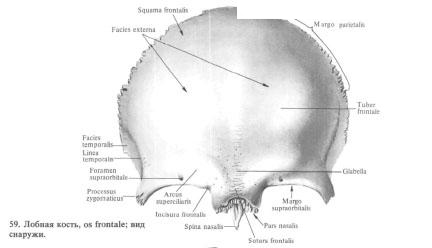 Наружная поверхность, facies externa, гладкая, выпуклая кпереди. По срединной линии не всегда заметно возвышение – метопический шов, sutura metopica, — след сращения имевшихся в раннем детском возрасте половин лобной кости. В передних отделах лобная поверхность чешуи переходит в глазничную поверхность, facies orbitalis, образуя с каждой стороны надглазничный край, margo supraorbitalis, являющийся верхней частью глазничного края, margo orbitalis. Выше и параллельно надглазничному краю более или менее рельефно выступает дугообразное возвышение – надбровная дуга, arcus superciliaris. Над каждой надбровной дугой видно округлое возвышение – лобный бугор, tuber frontale. Между выпуклостями надбровных дуг и немного выше их поверхность лобной чешуи в области надпереносья имеет вид несколько углубленной площадки – это глабелла, glabella. У внутренней трети надглазничного края имеется небольшая надглазничная вырезка, incisura supraorbitalis. Эта вырезка весьма изменчива и может быть выражена в форме надглазничного отверстия, foramen supraorbitale. Ближе к срединной линии, т. е. медиальнее, залегает не менее выраженная лобная вырезка, incisura frontalis (в надглазничной вырезке проходят латеральная ветвь надглазничного нерва и сосуды, в лобной — медиальная ветвь того же нерва и сосуды). На месте указанной вырезки может образоваться лобное отверстие, foramen frontale.