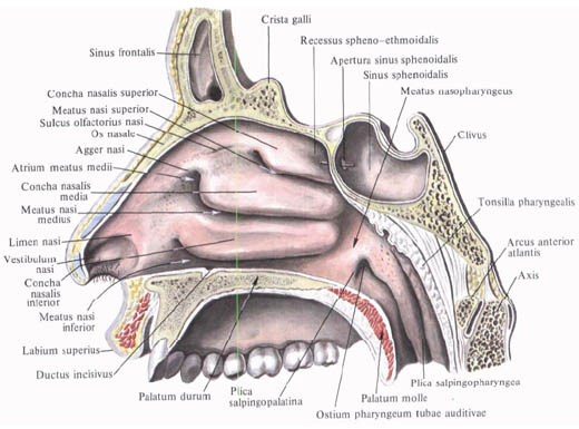 Полость носа, cavitas nasi, разделяется перегородкой носа, septum nasi, на две почти симметричные части.