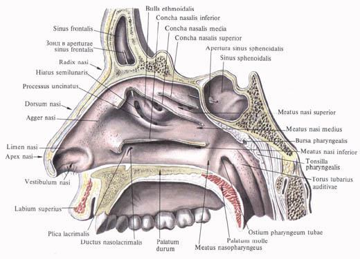 В полости носа, различают преддверие полости носа, vestibulum nasi, покрытое изнутри продолжающейся через ноздри кожей каружного носа, и собственно полость носа, cavitas nasi, выстланную слизистой оболочкой.