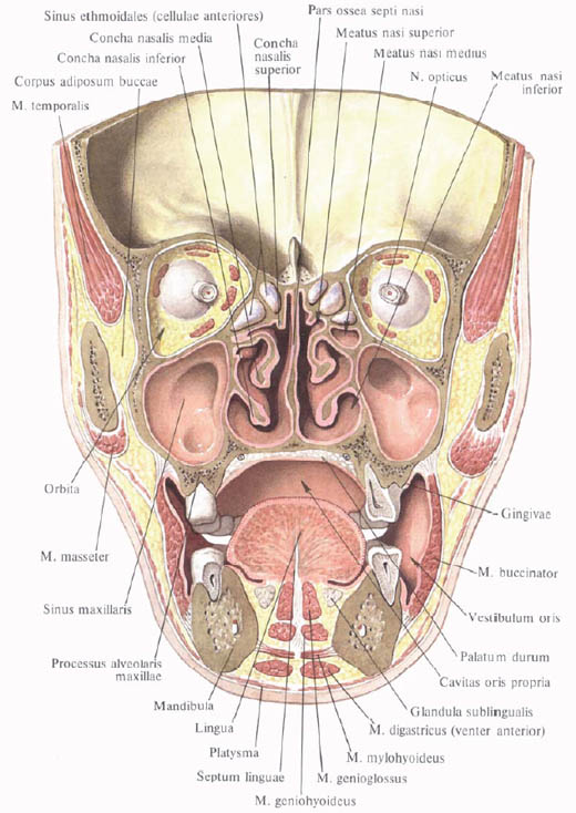 Окружающие полость носа кости являются воздухоносными и содержат околоносовые пазухи, sinus paranasales. Последние сообщаются с носовыми ходами: верхнечелюстная пазуха, sinus maxillaris, лобная пазуха, sinus frontalis, средние и передние ячейки решетчатой кости, cellulae ethmoidales mediales et anteriores, – со средним носовым ходом через решетчатую воронку, infundibulum ethmoidale, и полулунную расщелину, hiatus semilunaris; задние ячейки решетчатой кости, cellulae ethmoidalis posteriores, – с верхним носовым ходом и клиновидная пазуха, sinus sphenoidalis, – с общим носовым ходом на уровне верхнего хода через апертуру клиновидной пазухи, apertura sinus sphenoidalis.
