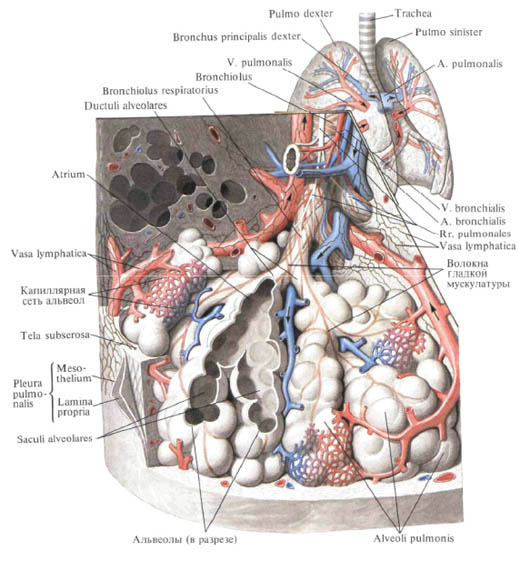 Таким образом, паренхима легкого состоит из системы ветвящихся воздухоносных трубок (бронхи, их ветви, бронхиолы, альвеолы) и ветвящихся кровеносных сосудов (артерии и вены), лимфатических сосудов и нервов. Все эти образования связаны между собой соединительной тканью.