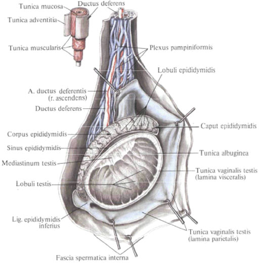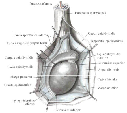 Яичко подвешено на семенном канатике (левое ниже правого) за задний край таким образом, что оно наклонено верхним концом вперед, а латеральной поверхностью – несколько назад.