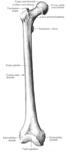 Бедренная кость, os femoris, самая длинная и толстая из всех длинных костей скелета человека. В ней различают тело и два эпифиза – проксимальный и дистальный.