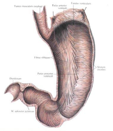 Мышечная оболочка желудка, tunica muscularis, состоит из двух слоев: продольного и кругового, а также из косых волокон.