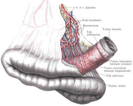 Стенка двенадцатиперстной кишки состоит из трех оболочек: слизистой, мышечной и серозной. Только начало верхней части (на протяжении 2,5-5 см) одето брюшиной с трех сторон; нисходящая и нижняя части расположены забрюшинно и покрыты адвентицией.