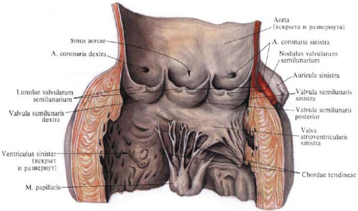 По окружности отверстия аорты прикрепляются три полулунные заслонки аорты, которые соответственно своему положению в отверстии называются правой, левой и задней полулунными заслонками, valvulae semilunares dextra, sinistra et posterior. Вместе они образуют клапан аорты, valva aortae.