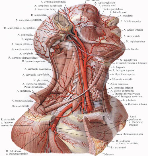 I. Глазная артерия, a. ophthalmica ,— парный крупный сосуд. Направляется через зрительный канал в глазницу, залегая снаружи от зрительного нерва. В глазнице пересекает зрительный нерв, проходя между ним и верхней прямой мышцей, направляется к медиальной стенке глазницы. Достигнув медиального угла глаза, глазная артерия распадается на концевые ветви: надблоковую артерию, a. supratrochlearis, и дорсальную артерию носа, а. dorsalis nasi. На своем пути глазная артерия отдает ветви (см. «Орган зрения», т. IV).