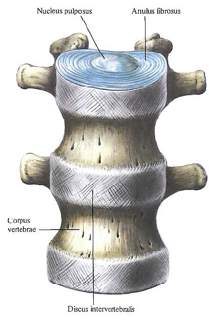 Центральная часть межпозвоночного диска – студенистое ядро – очень упругое и является своеобразной пружинящей прослойкой, которая при наклонах позвоночника смещается в сторону разгибания. На разрезе межпозвоночного диска студенистое ядро, сдавленное при нормальных условиях, выступает над поверхностью фиброзного кольца. Студенистое ядро может быть сплошным или иметь небольшую щелевидную полость.