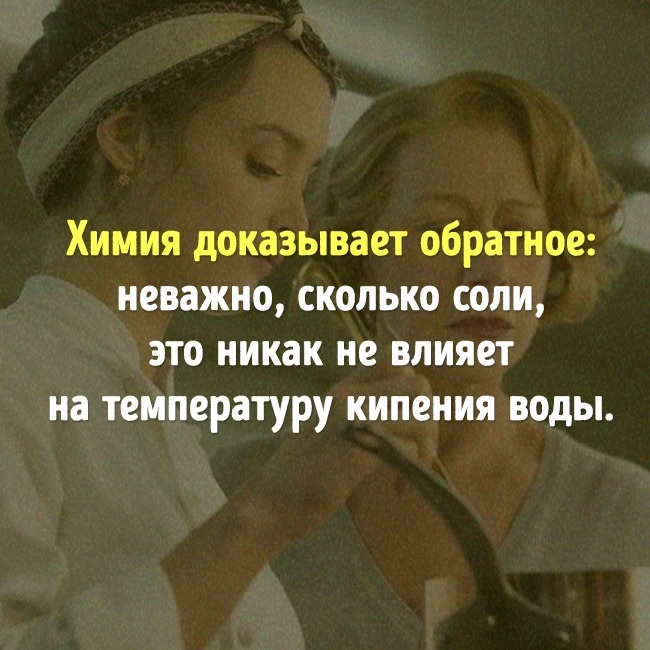 Химия же доказывает обратное: неважно, сколько соли в воде, ведь это никак не влияет на точку кипения воды. Это заставляет совершенно по-новому посмотреть на уроки химии в школе и расстроиться, что успеваемость именно по этому предмету оставляла желать лучшего.