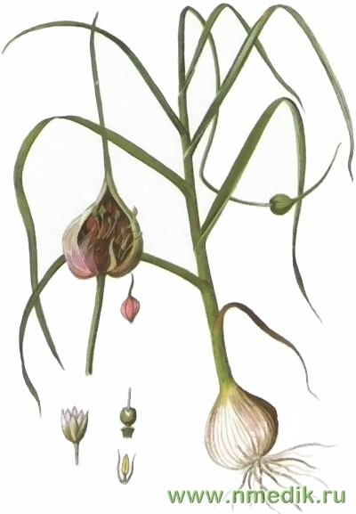 Ботаническая характеристика. Многолетнее травянистое растение. Луковица овально-сердцевидная, состоит из нескольких (иногда до 30) мелких луковичек-зубков, одетых одной оболочкой. Стебель высотой до 1 м, прямой. Листья прикорневые, широколинейные, длинные. Цветки невзрачные, зеленовато-белые, собранные в соцветие – зонтик. Цветет в июле-августе. Вместо плодов на верхушке стебля образуются маленькие воздушные луковички, служащие для вегетативного размножения чеснока.