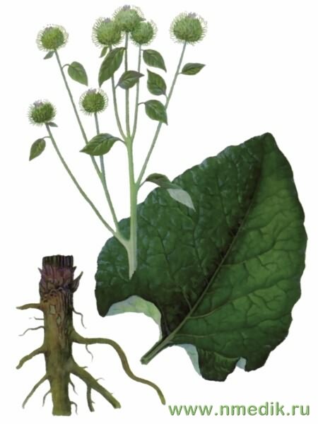 Химический состав. В корнях лопуха содержится полисахарид инулин (до 45%), протеины (около 12,3%), эфирные масла (до 0,17%), кислоты (стеариновая и пальмитиновая), белковые вещества, слизь, дубильные вещества и смолы.