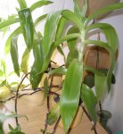 Это довольно крупное растение с двумя типами побегов, одни прямостоячие, мясистые внешне похожие на молодую кукурузу, от 70 до 150 см высоты, с нормально развитыми листьями длиной 20-30 см, шириной 5-6 см, другие - горизонтальные (усы) с недоразвитыми листьями. Усы, состоят из «суставчиков», на концах которых формируется листовая метелочка.