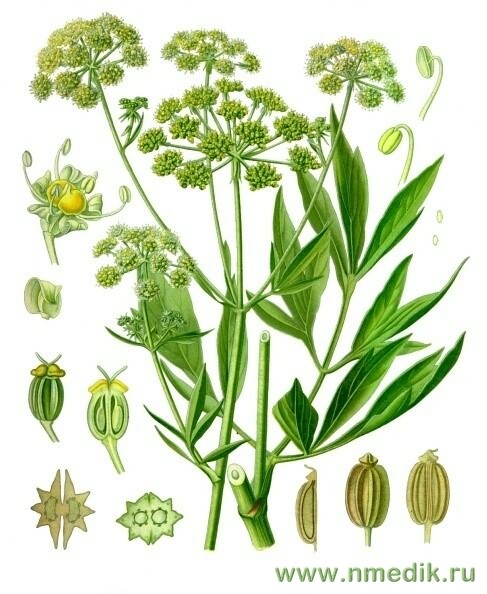 Ботаническая характеристика. Стебель круглый, трубчатый, вверху разветвленный, высотой 100 – 250 см, листья блестящие, перисто- или дваждыперисторассеченные, с большими обратнояйцевидными или округлоромбическими, на верхушке надрезанно-зубчатыми сегментами. Цветки двуполые, правильные, мелкие, светло-желтые, пятилепестковые, собранные на верхушке в сложные зонтики, окруженные у основания многолистными обертками. Плод – желто-бурая двусемянка. Цветет в июне – июле. Плоды созревают в сентябре.