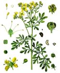 Ботаническая характеристика. Семейство рутовые. Многолетнее травянистое растение или полукустарник с прямым, ветвистым серовато-зеленоватым стеблем высотой до 50 см. Листья дважды- и триждыперисторассеченные, очередные. Желтовато-зеленоватые цветки на верхушках стеблей собраны в полузонтичные соцветия. Цветет в июне–августе. Плод – угловатая коробочка – созревает в июле–сентябре. Все растение имеет сильный неприятный запах.