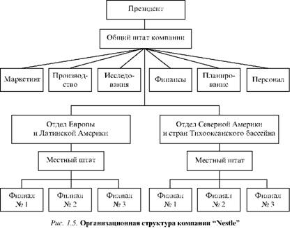 Например, компания "Nestle", которая была образована в Швейцарии, почувствовав необходимость выхода на международный рынок, интернационализировала свою деятельность путем создания зарубежных отделений по всему миру. Организационная структура этой компании (рис. 1.5) базируется на географическом принципе, который предполагает ответственность менеджеров на местах за ведение дел, в то время как главное руководство удерживает в своих руках планирование и контроль. Все географические регионы, включая базовый (швейцарский) рынок, равноправны в организационном