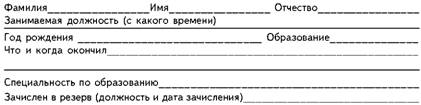 | Фамилия, имя, отчество | Занимаемая должность | Год рождения | Образование, когда и что окончил, квалификация и специальность | На какую должность рекомендуется | Когда зачислен в резерв, в т. ч. по рекоменд. аттест. комиссии | Отметка о выдвижении (когда и на какую должность) |