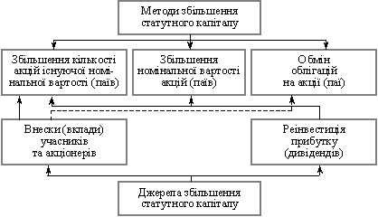 Збільшення статутного капіталу банку здійснюється шляхом випуску нових акцій (паїв), збільшення номінальної вартості акцій (паїв) або обміну облігацій на них. В останньому випадку статутний капітал збільшується на загальну вартість облігацій, що обмінюються на акції (паї). Джерелами збільшення статутного капіталу є власні кошти учасників (акціонерів, засновників), які сформувалися переважно за рахунок нагромадження ними прибутку, а також реінвестиція банківського прибутку (дивіденди). В останньому випадку можуть бути використані цільові фонди, створені за рахунок прибутку після оподаткування або сам нерозподілений прибуток. Ідеться фактично про те, що джерелами формування та збільшення статутного капіталу банку виступають внутрішні джерела як самих учасників (акціонерів), так і банку. Використання внутрішніх джерел банку для збільшення його статутного капіталу фактично означає, що у такому разі розмір власного капіталу банку залишається незмінним. Зміни відбуваються лише всередині, між різними складовими власного капіталу. Змінюється частка власного капіталу, яка приносить дивіденди (статутний капітал), і капіталу, який їх не приносить (нерозподілений прибуток тощо). По суті, збільшення статутного капіталу за рахунок внутрішніх джерел банку є не чим іншим, як фінансування цього збільшення за рахунок дивідендів, невиплачених учасникам (акціонерам). Тому вимоги Національного банку України до власного капіталу банків фактично означають, що останні, вирішуючи питання щодо збільшення статутного капіталу, повинні віддавати (і фактично віддають) перевагу такому джерелу, як додаткові внески (вклади) учасників (акціонерів). Однак це не применшує ролі внутрішніх джерел у формуванні як статутного капіталу, так і (особливо) інших складових власного капіталу банку.
