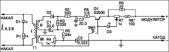 Конструктивно прибор выполнен в компактном пластмассовом корпусе. Положительный вывод прибора и провода его подключения к выводам накала снабжены “крокодилами”. Отрицательный вывод удобно оформить в виде щупа, представляющем собой толстую металлическую иглу, вмонтированную в корпус от фломастера. В этом же щупе удобно расположить кнопку SW1.