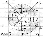 Теперь, когда один сегмент вытолкнут наведенным полем полу- кольцевого магнита то симметрия кольца нарушается и оно за счет размыкания общей магнитной линии кольца – воздушными зазорами А и В рис. 3 – преобразуется в линейный, согнутый магнит,а он имеет максимум напряженности поля на краях – в зазорах А и В и минимум напряженности в точке С рис. 3, то есть теперь система: магнит – разрезное кольцо является не симметричной и магнит на подшипнике куллера довернется, затратив свою энергию -до точки равновесия системы, магнит будет пытаться вложить свой синус напряженности поля по телу магнита в косинус наведенного на разрезном кольце магнитногополя.
