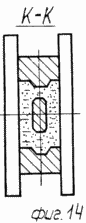4. После остановки прижимов 11 и 12 сходятся гидроприжимы 9 и 10, осуществляя поперечное прессование брикета до размера готового изделия. Скосы 13 позволяют более равномерно и последовательно сжимать брикет, который теперь сжат усилием до 40 тс.