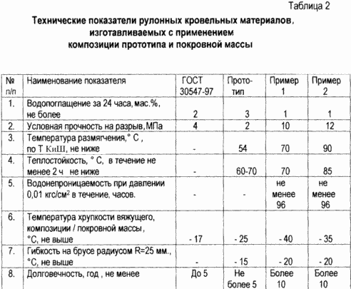 Технические характеристики рулонных кровельных материалов, изготовленных с применением покровной массы по примерам, представлены в таблице 2.