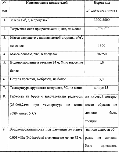 Оптимальное сочетание компонентов материала, обеспечивающих лучшую растворимость и совместимость полимера с битумом, и режимов способа, обеспечивающих глубокую пропитку и сцепление вяжущего слоя с основой, позволяет повысить качество материала за счет повышения таких характеристик, как водонепроницаемость, сопротивление изгибу, сопротивление разрывным нагрузкам при обеспечении возможности уменьшения толщины материала и его веса.