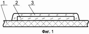 Для способа по предлагаемому техническому решению характерны следующие особенности. В простейшем случае (см. фиг.1) ФЭП (элемент СБ) поз.2 герметизируют на несущем основании поз.1 посредством отверждающейся композиции поз. 3 (в данном случае предполагается, что условия эксплуатации и/или параметры температурного расширения элементов поз. 1, 2, 3 допускают штатную работу конструкции в заданном интервале жизненного цикла изделия).