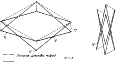 Единичная рама солнечной батареи состоит из четырех пар перекрещивающихся стержней 14, соединенных по углам шарнирами 15. В местах перекрещивания каждая пара стержней соединена шарниром 16, причем его расположение не обязательно должно находиться на середине стержней. Пара угловых шарниров 15, расположенных в одном углу каркаса и находящихся наиболее близко друг от друга, соединяется между собой натяжным устройством 17. Число натяжных устройств, особенно для каркаса с несколькими окнами, определяется исходя из жесткости используемых стержней 14 и конкретных условий эксплуатации. Окно, в котором размещены модули, образовано раздвинутым в рабочее состояние единичным каркасом. При необходимости создания более мощной солнечной батареи к угловым шарнирам 15 возможно присоединение дополнительных пар стержней 14, образующих в сочетании с дополнительными угловыми шарнирами новые окна для размещения модулей.