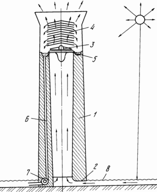 ![]() | Станция содержит тяговую башню 1 с воздухозаборниками 2 у основания. Стенки башни выполнены из теплоизоляционного материала. В вершине башни установлен турбогенератор 3 для отбора мощности и поднимающегося по стволу башни потока воздуха. Над турбогенератором установлен уловитель влаги 4, выполненный в виде ребристого лабиринта и установленный под углом к вертикальной оси турбогенератора. Емкость 5 для сбора воды (конденсата), расположенная на вершине башни, связана системой трубопроводов 6 с гидрогенератором 7, размещенным у основания башни. У основания башни расположено пленочное оптически прозрачное покрытие 8. |