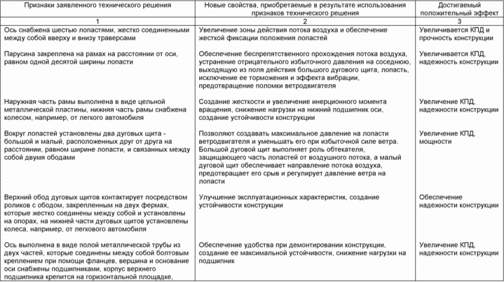 Поставленная задача достигается тем, что в парусно-щитовом ветродвигателе, содержащем установленные на вертикальной оси лопасти, выполненные в виде рам с натянутой на них парусиной, ось снабжена шестью лопастями, жестко соединенными между собой вверху и внизу траверсами, парусина закреплена на рамах на расстоянии от оси, равном одной десятой ширины лопасти, наружная часть рамы выполнена в виде цельной металлической пластины, нижняя часть рамы снабжена колесом, бывшим в употреблении, например от легкового автомобиля, вокруг лопастей установлены два дуговых щита - большой и малый, расположенных друг от друга на расстоянии, равном ширине лопасти, и связанных между собой двумя ободами, причем верхний обод дуговых щитов контактирует посредством роликов с ободом, закрепленным на двух фермах, которые жестко соединены между собой и установлены на опорах, на нижней части дуговых щитов установлены колеса, бывшие в употреблении, например от легкового автомобиля, ось выполнена в виде полой металлической трубы из двух частей, которые соединены между собой болтовым креплением при помощи фланцев, вершина и основание оси снабжены подшипниками, причем корпус верхнего подшипника крепится на горизонтальной площадке, концы которой скрепляют две фермы в средней части, ролики крепятся по внешнему периметру обода, закрепленного на фермах, колеса дуговых щитов взаимодействуют с желобом, выполненным эксцентрично относительно оси. Анализ отличительных признаков, создающих положительный эффект, представлен в таблице.