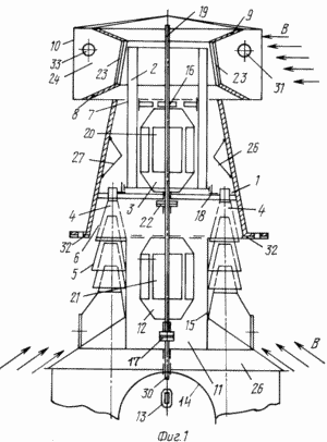 Воронки 5 эжекторных систем 4 врезаны в стенку шахты 15 (фиг. 2 и 3) под углом. Вал 30 и электромагнитная муфта 17 разгоняет третий генератор 13. Шахта 15 второго генератора 12 - полугерметичная, а шахта 31 (фиг. 2) - для третьего генератора 13. Башня 1 в средней части имеет соединение 32 на случай перевозки к месту установки или ремонта, а концентраторы 24 имеют окна 33 для строп.