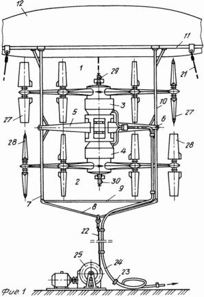 В гидрогенераторном исполнении флюгерные системы ориентации в однонаправленном потоке отсутствуют за ненадобностью, а первоначальная ориентация лопастей осуществляется с пульта управления распределительной подстанции 26 по кабелю дистанционным включением червячных редукторов, соединенных с центральной невращающейся осью, кинематически связанной с лопастями.