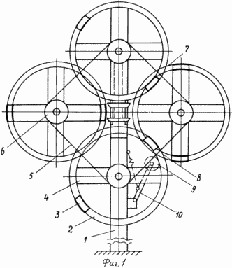 Ветроэлектрогенератор сегментного исполнения состоит из башни 1, ветроколес, имеющих обод 2 с ферромагнитными роторными сегментными элементами 3. Ветроколеса велосипедного типа имеют спицы - лопасти 4, ветроколеса связаны гибким элементом 5 (например, цепью или зубчатым ремнем), который охватывает шкивы 6, укрепленные на ступице. В центре, между вертикально установленными ветроколесами и одновременно между горизонтально установленными ветроколесами, установлен статор 7. На башне установлено вращающееся основание 8, а гибкий элемент снабжен натяжным устройством - роликом 9 с подпружиненным рычагом 10. Вращающееся основание снабжено хвостом 11, поперечной траверсой 12, на концах которой установлены подшипниковые узлы 13.