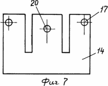 Рассмотрим устройство статора. Его основу составляют две Ш-образные пластины 14, расположенные в двух параллельных плоскостях А и Б, две Г-образные пластины 15, которые размещены перпендикулярно плоскостям А и Б. При этом каждой из боковых стоек Ш-образной пластины прикреплена Г-образная пластина с помощью болтов 16, проходящих через отверстия 17 и 18. Центральный немагнитный болт 19, пропущенный через отверстия 20 и центральный магнит 21, стягивает всю конструкцию, в том числе и катушку 22, надетую на магнит 21.